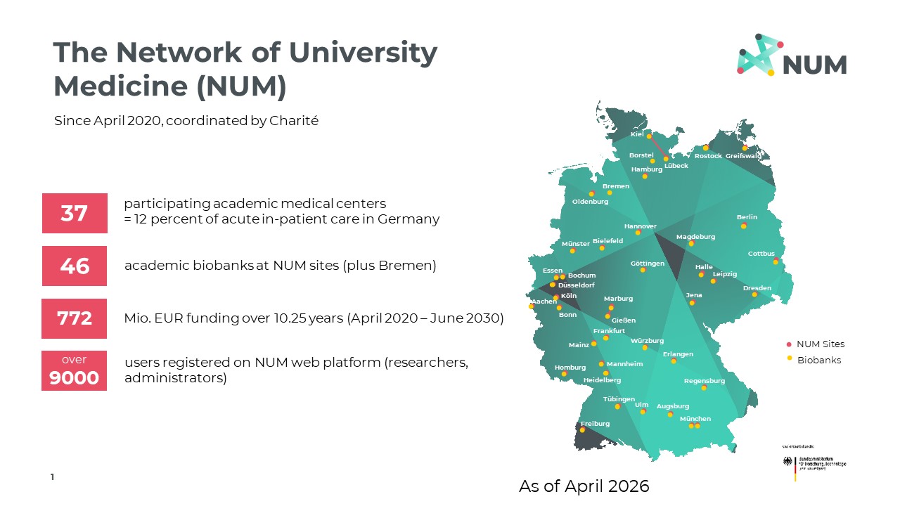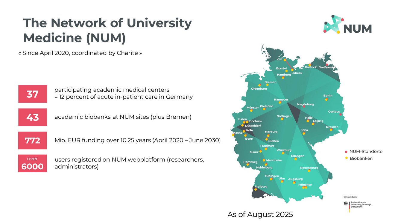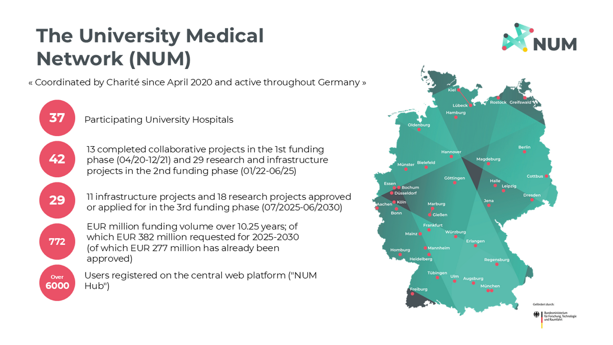 Since July 1, 2025, NUM has been funded by the Federal Ministry of Research, Technology, and Space (BMFTR) for a third funding period lasting five years. Charité – Universitätsmedizin Berlin is responsible for coordinating NUM. In order to secure the structures created within NUM in the long term, the BMFTR has promised to continue funding the network.