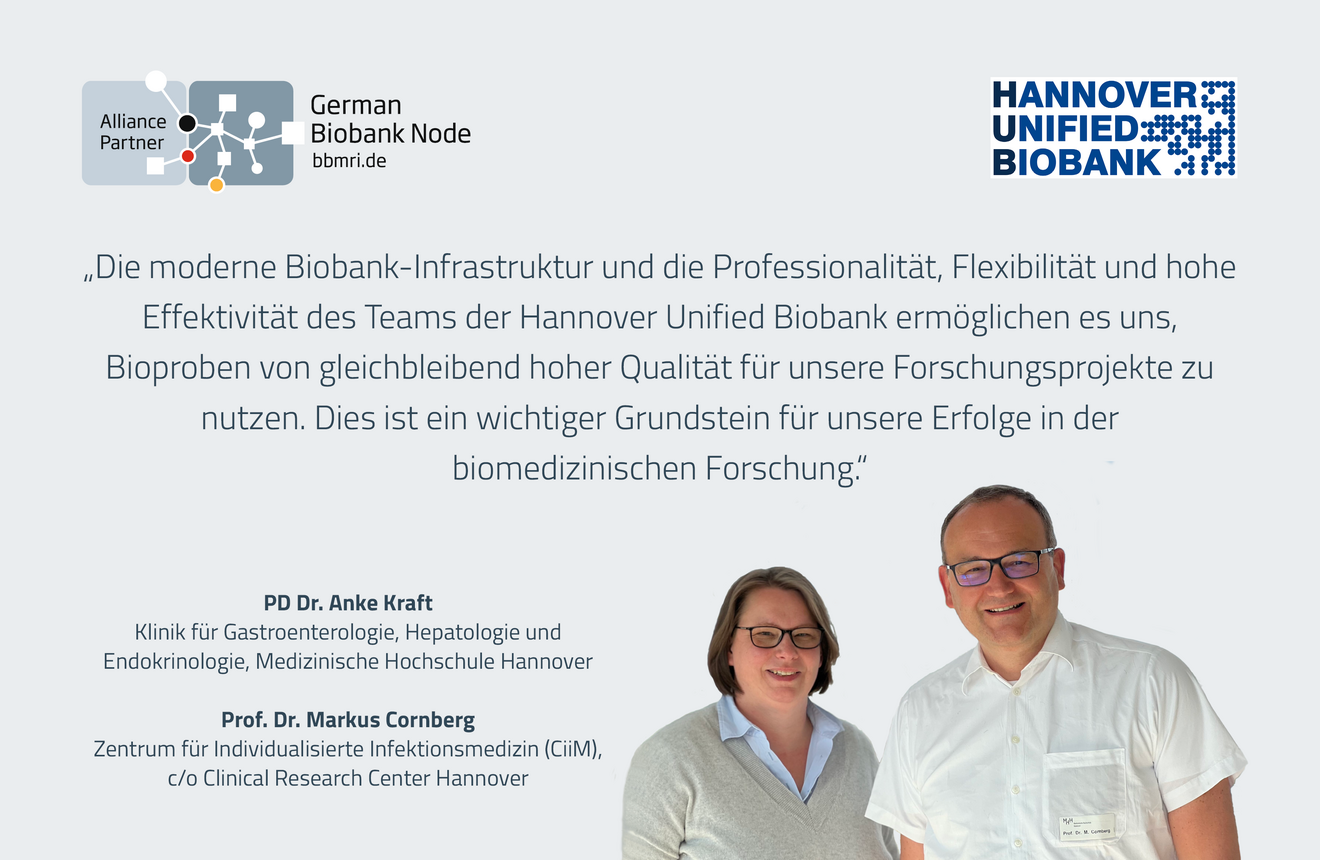 The HUB works to the highest quality standards and has been accredited in accordance with DIN EN ISO 20387:2020 since 2024. Standardised processes and a high degree of automation in the area of sample processing (EasyBlood / ChemagicSTAR, Hamilton) enable high sample quality. Samples are stored according to the highest safety standards in liquid nitrogen tanks, -80°C freezers and in a fully automated -80°C storage system (BIOS M, Hamilton). All quality data relevant to the biological materials and a minimum data set are stored centrally using a biobank information management system (CentraXX, Kairos). The samples are linked to clinical data via the MHH data warehouse (DWH). The HUB has a data protection concept and an ethics vote and already works with "broad consent" patient authorisation.