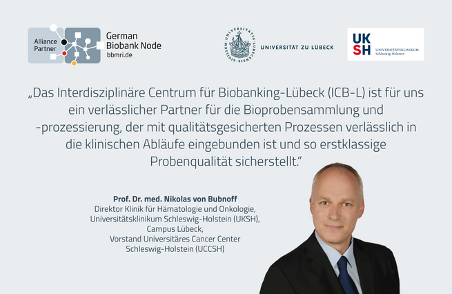 The Interdisciplinary Centre for Biobanking-Lübeck (ICB-L) is a hospital-integrated central biobank of the University of Lübeck in cooperation with the University Hospital Schleswig-Holstein on the Lübeck campus and the Fraunhofer Research Institution for Marine Biotechnology and Cell Technology. It is used by over 40 specialist disciplines. The ICB-L supports cutting-edge research in precision medicine for the benefit of patients and is involved in numerous national and international research networks. Certified according to DIN EN ISO 9001, it has been using a broad consent since 2015, which, in addition to the use of the latest technologies, also enables cooperation with academic and industrial partners in Germany and abroad. The ICB-L specialises in automated nitrogen storage below -150°C for sample storage of liquid and solid biological materials. The ICB-L carries out pre-analytical research from collection to storage in a closed cold chain to guarantee the highest sample quality. Based on 2,800 campus-wide harmonised parameters, CentraXX manages sample, research and clinical data as a central database. The latter is provided via interfaces to the hospital information system.