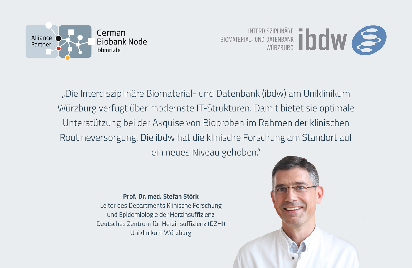 The Interdisciplinary Biomaterial and Database Würzburg (ibdw) is a joint institution of the University of Würzburg and the University Hospital of Würzburg. Its aim is to systematically collect and store liquid and solid biosamples with broad consent in accordance with the highest quality standards (OECD/ISBER recommendations 2012 & 2014). The samples are acquired from outpatients and inpatients at all clinics of the University Hospital of Würzburg.