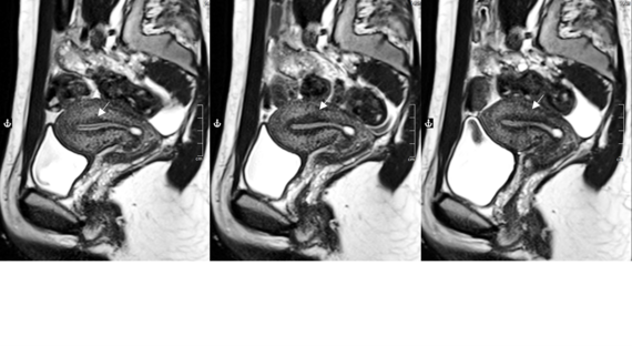 Abbildung 1: T2w HASTE sagittal links initial im Vergleich zu den im Abstand von 10 min (mitte) und 17 min (rechts) aufgenommenen Wiederholungen der MRT-Sequenz. Erkennbar ist eine deutliche Variabilität der Morphologie und Dicke der Junktionalzone (JZ), sowie im rechten Bild eine Verdickung der Vorderwand. © Radiologisches Institut, Universitätsklinikum Erlangen