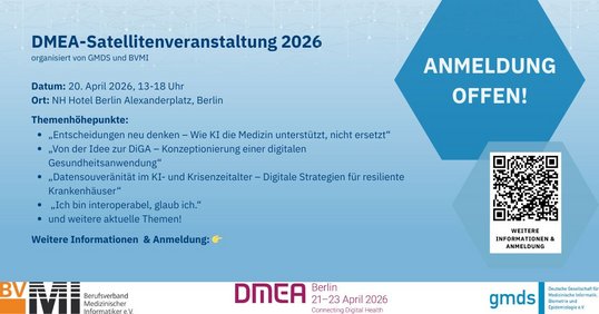 Wir möchten Sie gerne auf die DMEA-Satellitenveranstaltung 2026 von GMDS (Deutsche Gesellschaft für Medizinische Informatik, Biometrie und Epidemiologie e.V.) und BVMI (Berufsverband Medizinischer Informatiker e.V.) aufmerksam machen und Sie herzlich einladen, für einen fokussierten Austausch und intensiven Wissenstransfer zu aktuellen Themen der Gesundheits-IT zusammenzukommen!