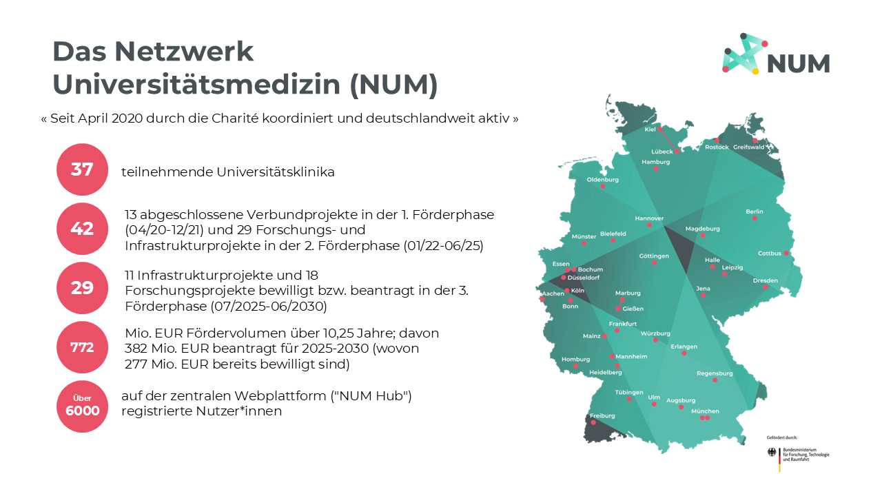 Seit 1. Juli 2025 wird das NUM in der dritten Förderperiode mit einer fünfjährigen Laufzeit vom Bundesministerium für Forschung, Technologie und Raumfahrt (BMFTR) gefördert. Mit der Koordination des NUM ist die Charité – Universitätsmedizin Berlin betraut. Um die im NUM entstandenen Strukturen dauerhaft zu sichern, hat das BMFTR eine Verstetigung des Netzwerks in Aussicht gestellt.